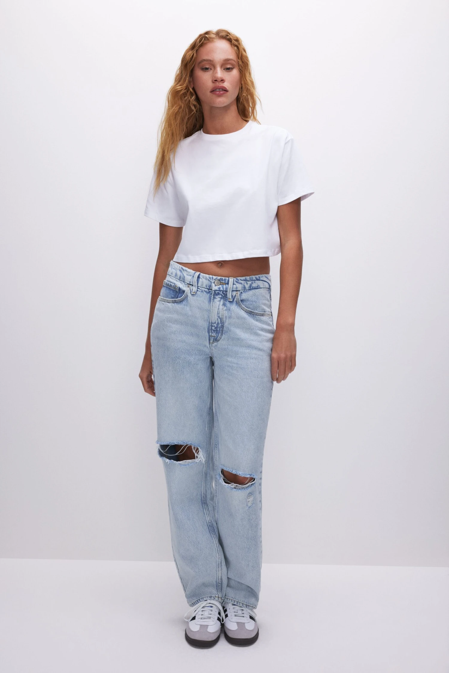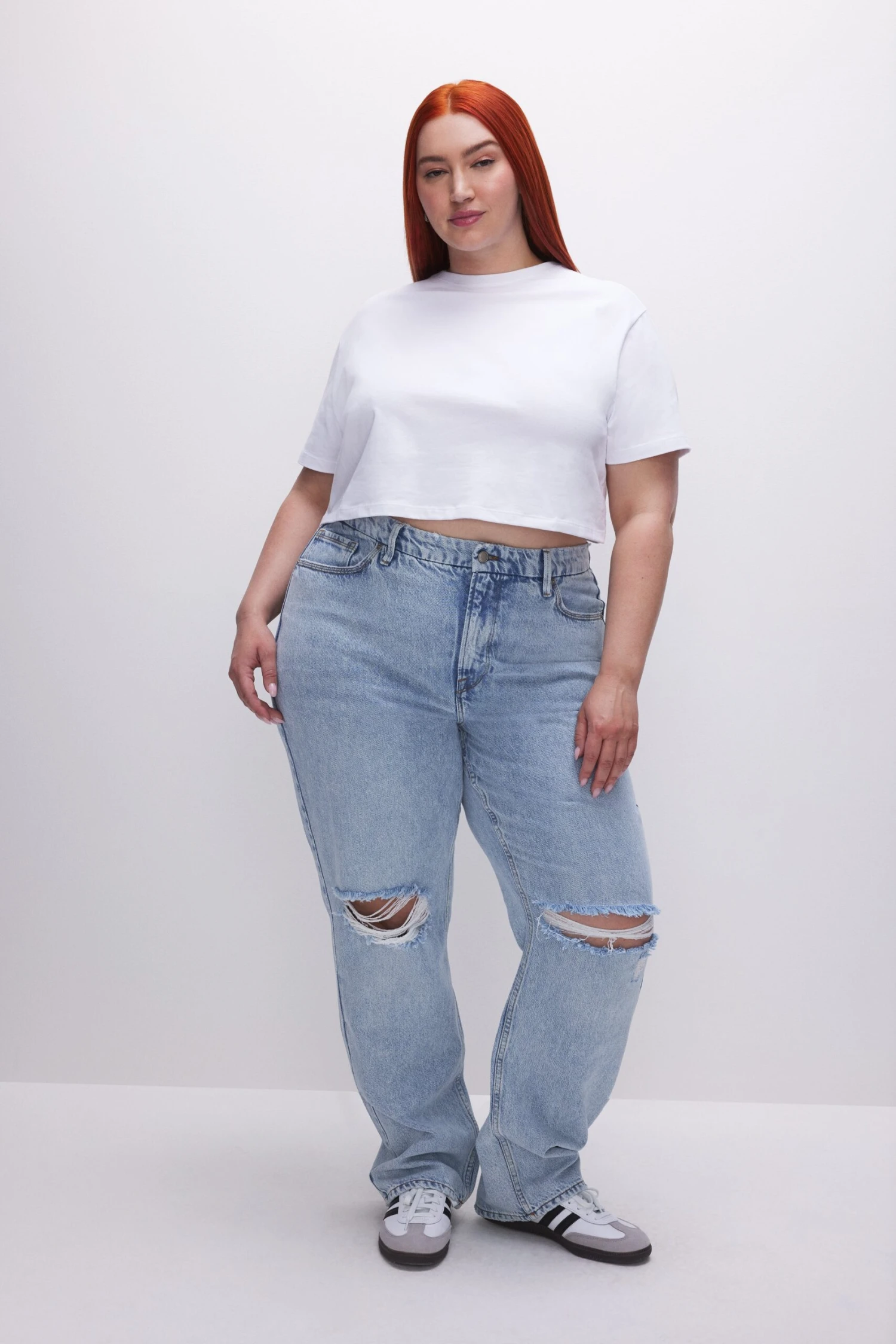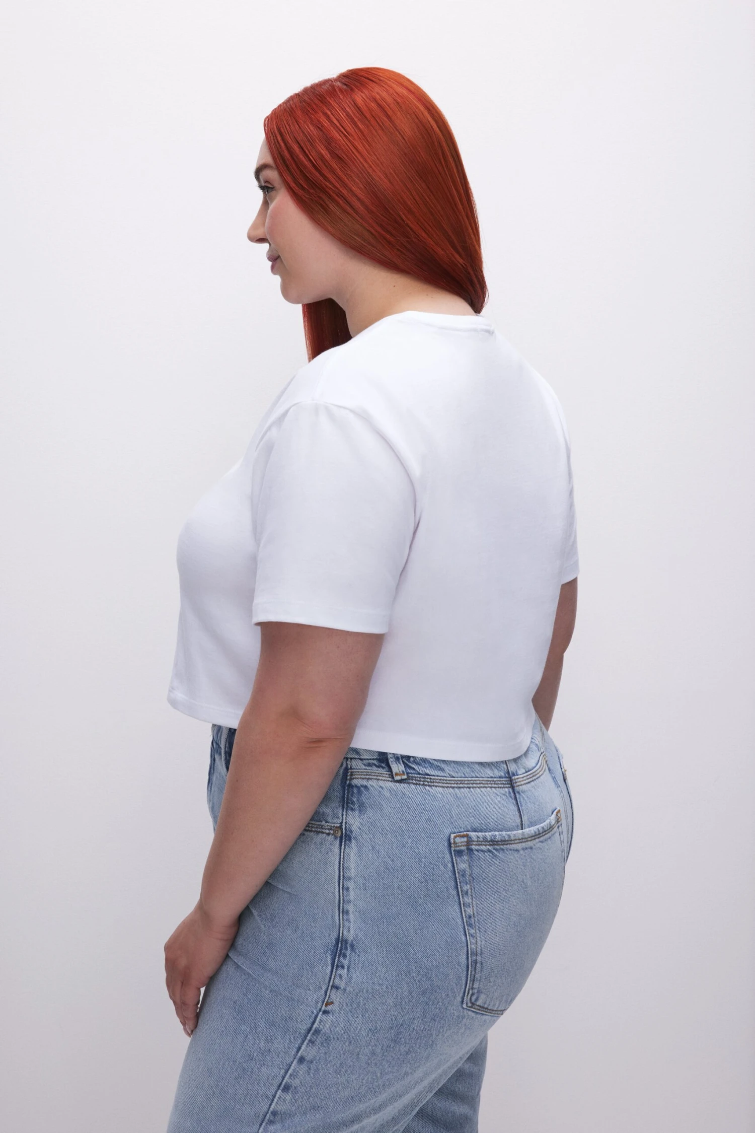 The Cotton Cropped Tee is the perfect addition to your everyday wardrobe. Made from super soft cotton, this tee feels like you’ve had it for years, providing comfort and familiarity with every wear. The cropped, boxy cut adds a modern and stylish touch, whether you’re dressing up, dressing down or just relaxing at home.
