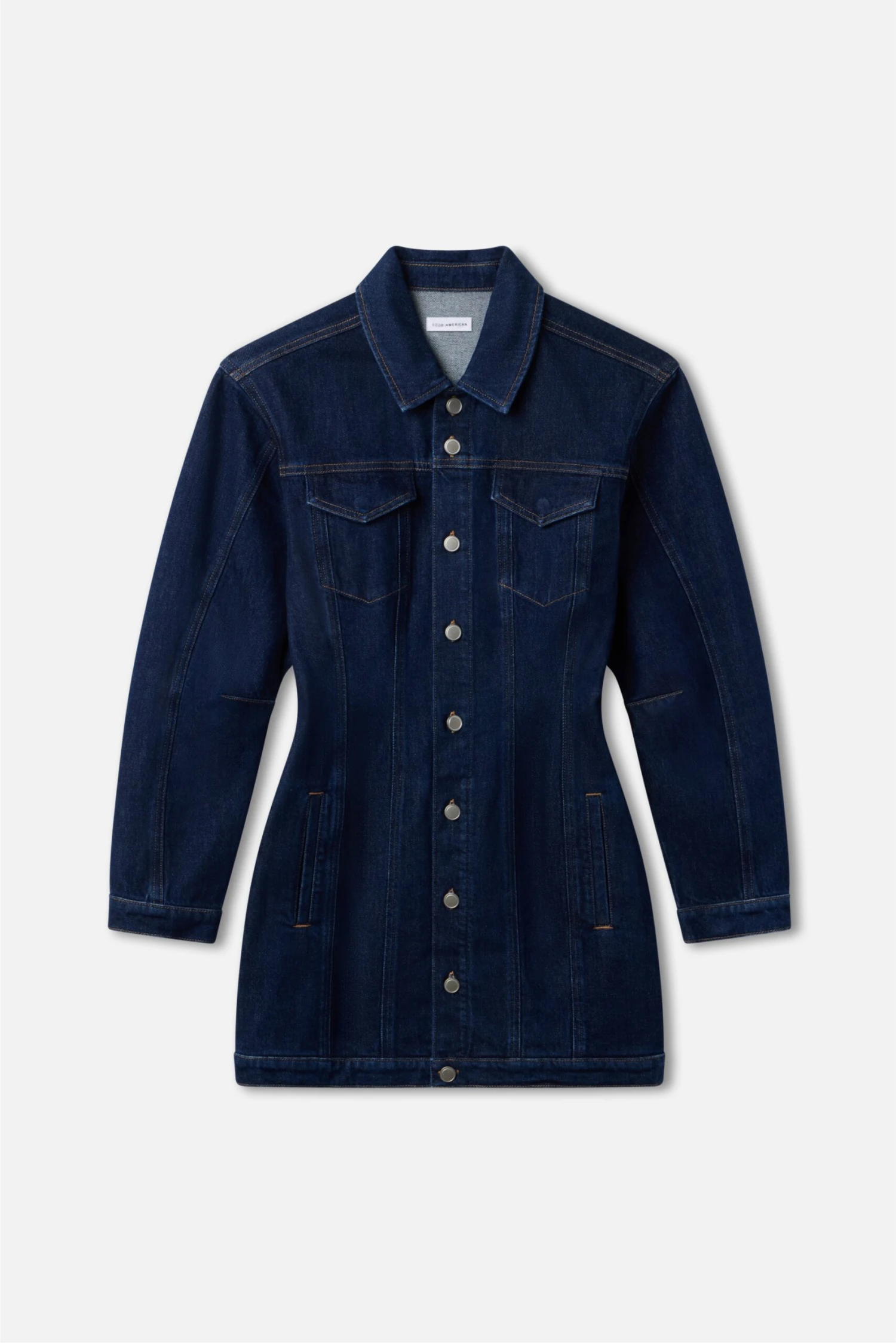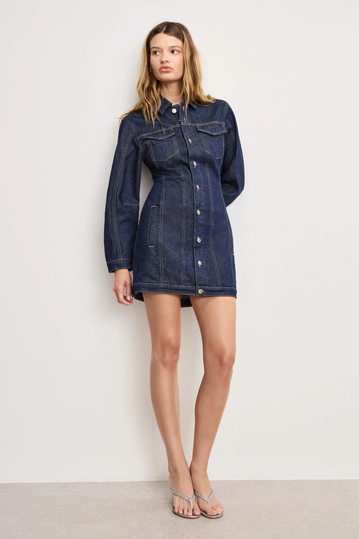 Sleek silhouette meets bold volume in exaggerated barrel sleeves that steal the spotlight. This mini denim dress sculpts your shape while the dramatic sleeves make you the main event – effortlessly commanding every room you enter.