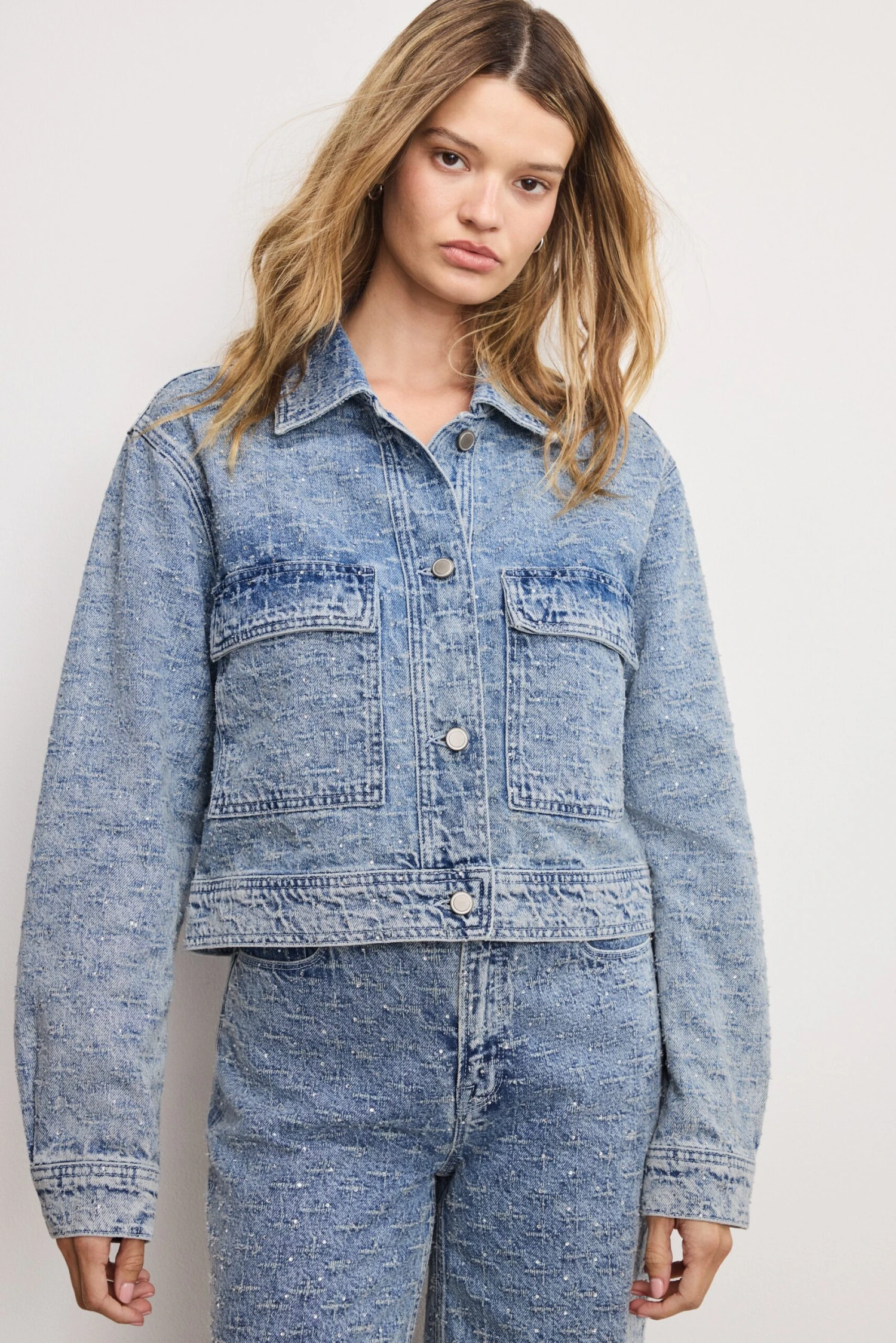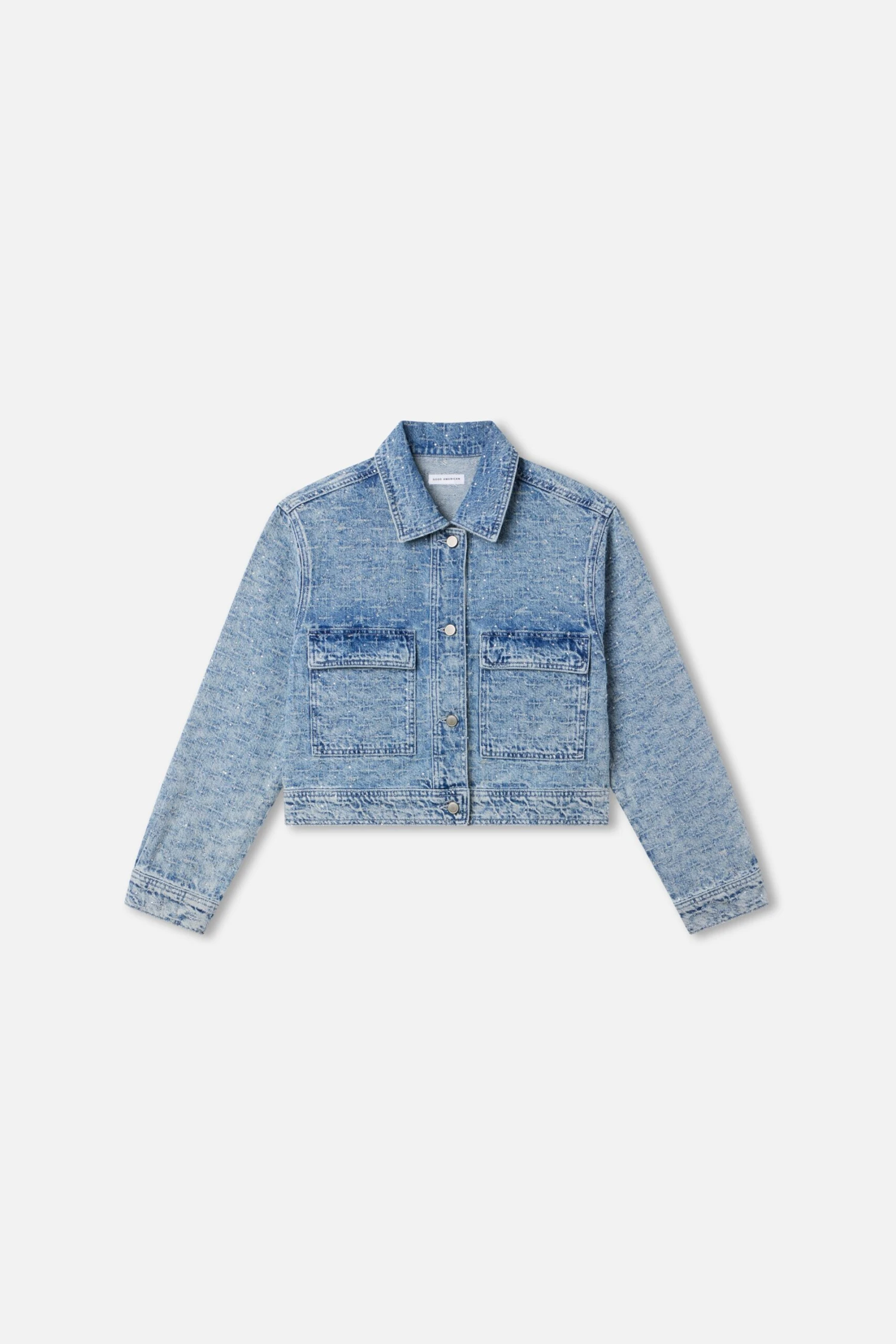 The Crystal Denim Jacket keeps it chill with a boxy fit and soft, worn-in blue denim, while the subtle crystal accents throw in that little pop of something extra. Toss it over anything to level up the vibe.