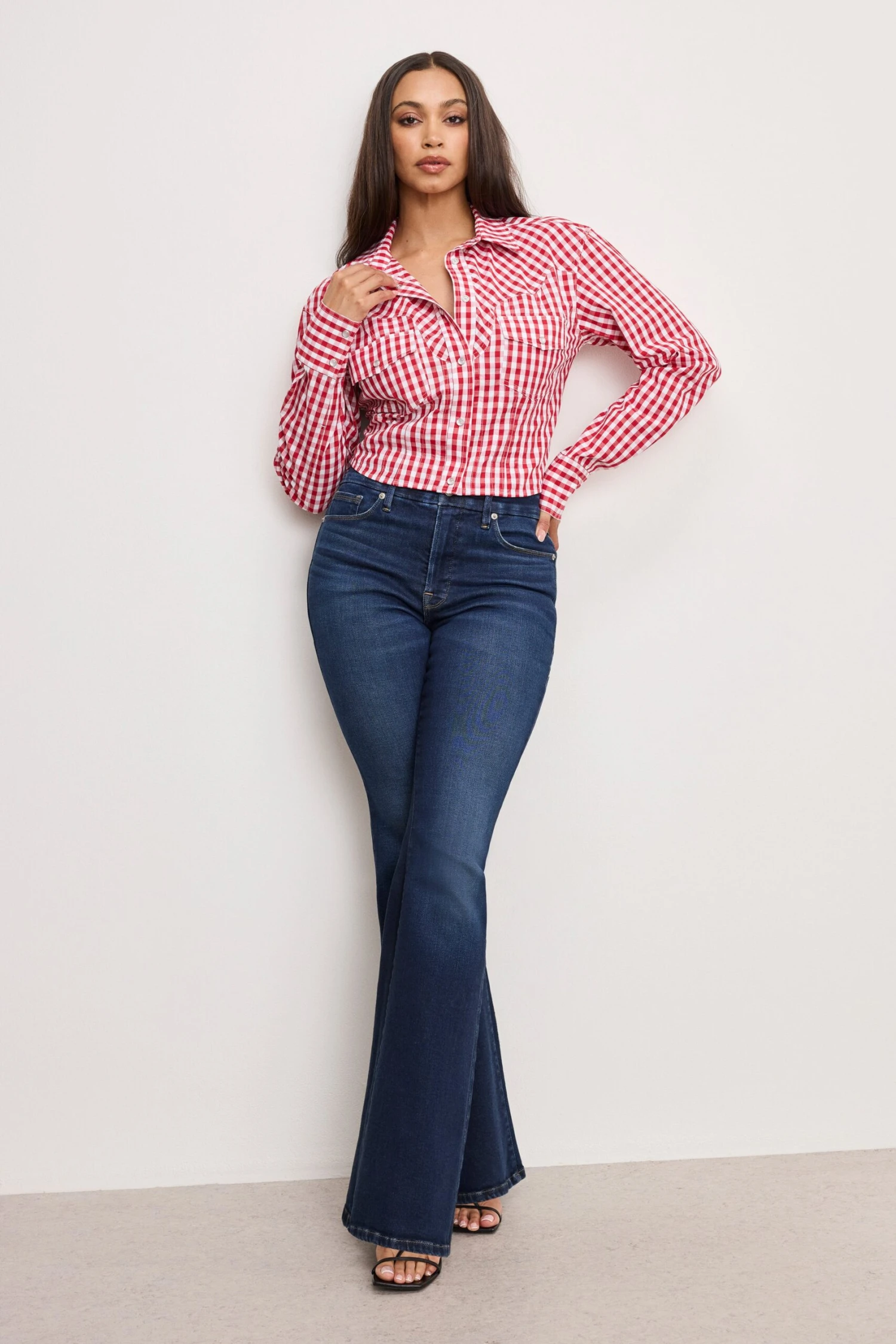 The Dolly Country Corset Shirt heats things up. With corset-inspired details and a dash of southern charm, its structured design and feminine edge blends timeless style with a red gingham twist. Ready for anything from daytime strolls to late-night line dances, it’s the perfect mix of rugged and refined.