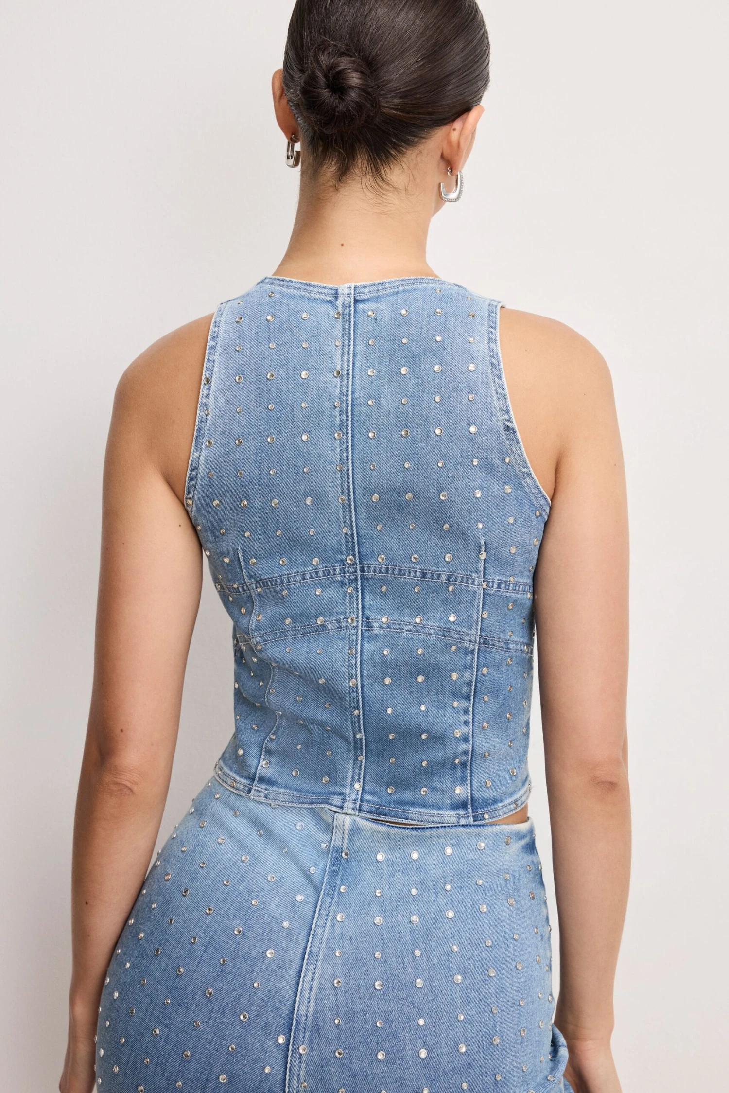 The Dolly Crystal Denim Vest is where denim meets Dolly’s signature sparkle. With crystal-studded details and a classic denim fit, it’s the ultimate statement piece that adds the right amount of glamour to any outfit.