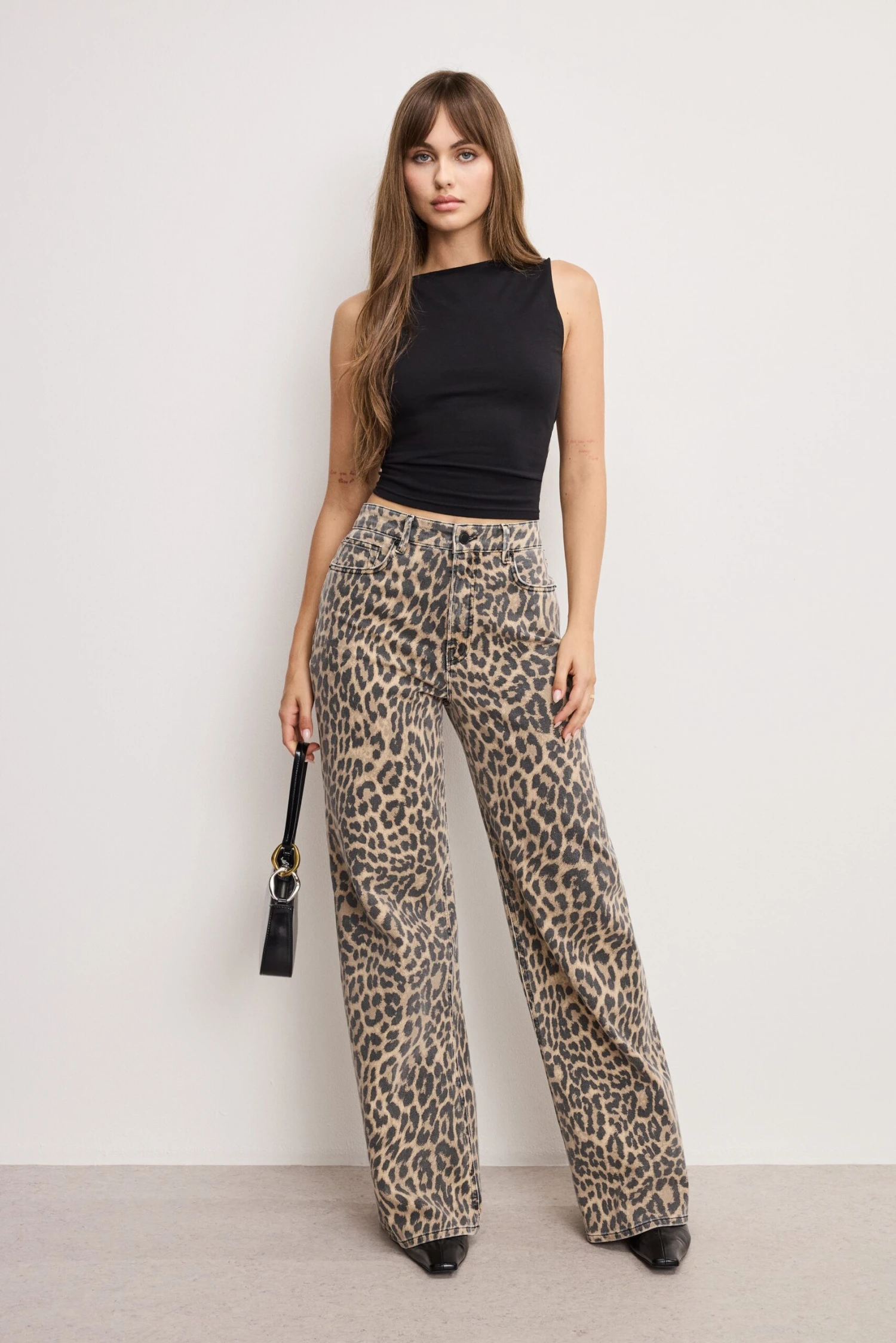 The ultimate lounge-around jeans, featuring a mid-rise waist and wide relaxed legs for effortless style, maximum comfort and a leopard print twist.