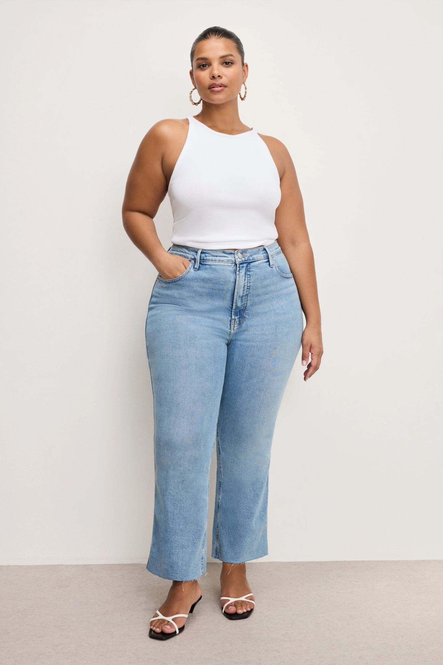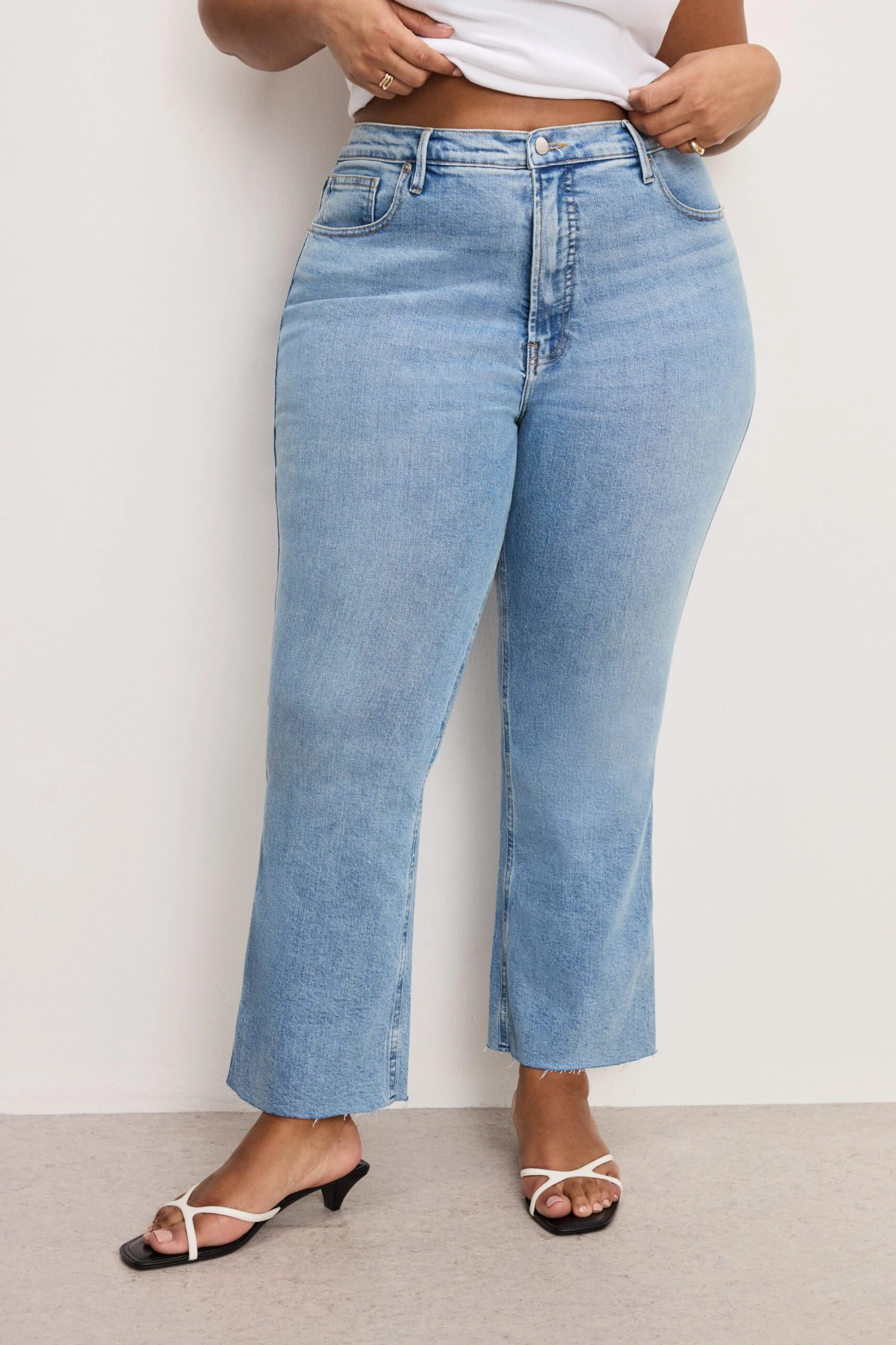 The ultimate statement jeans, featuring a high-rise waist, a raw hem, and a flattering kick flare silhouette.