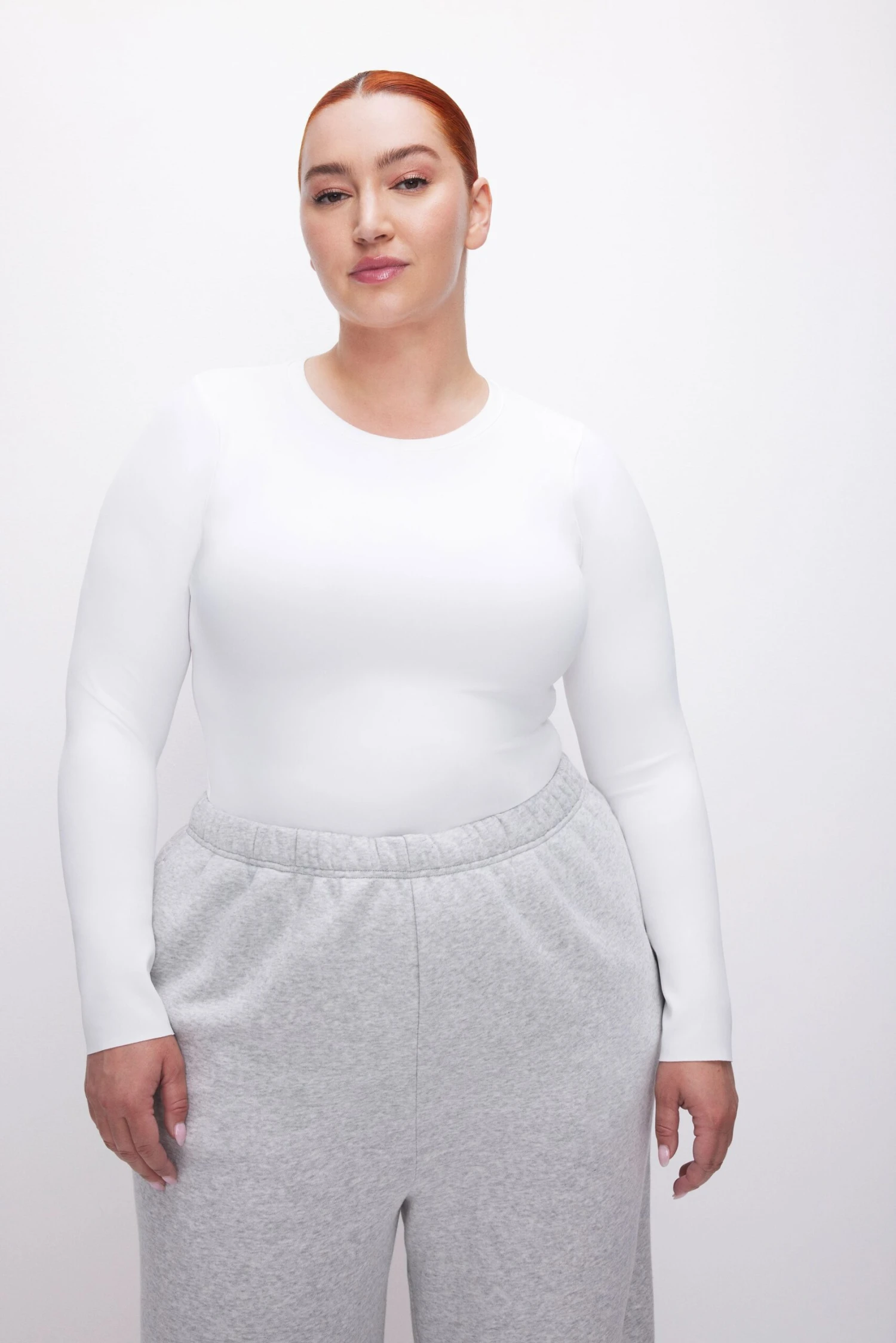 The curve-hugging, shape-enhancing, confidence boosting essential for every wardrobe. The Scuba Crewneck Bodysuit is made from a compact double knit stretch fabric that holds you in and smooths you out. Wear this with your favorite pair of jeans for the ultimate go-to outfit.