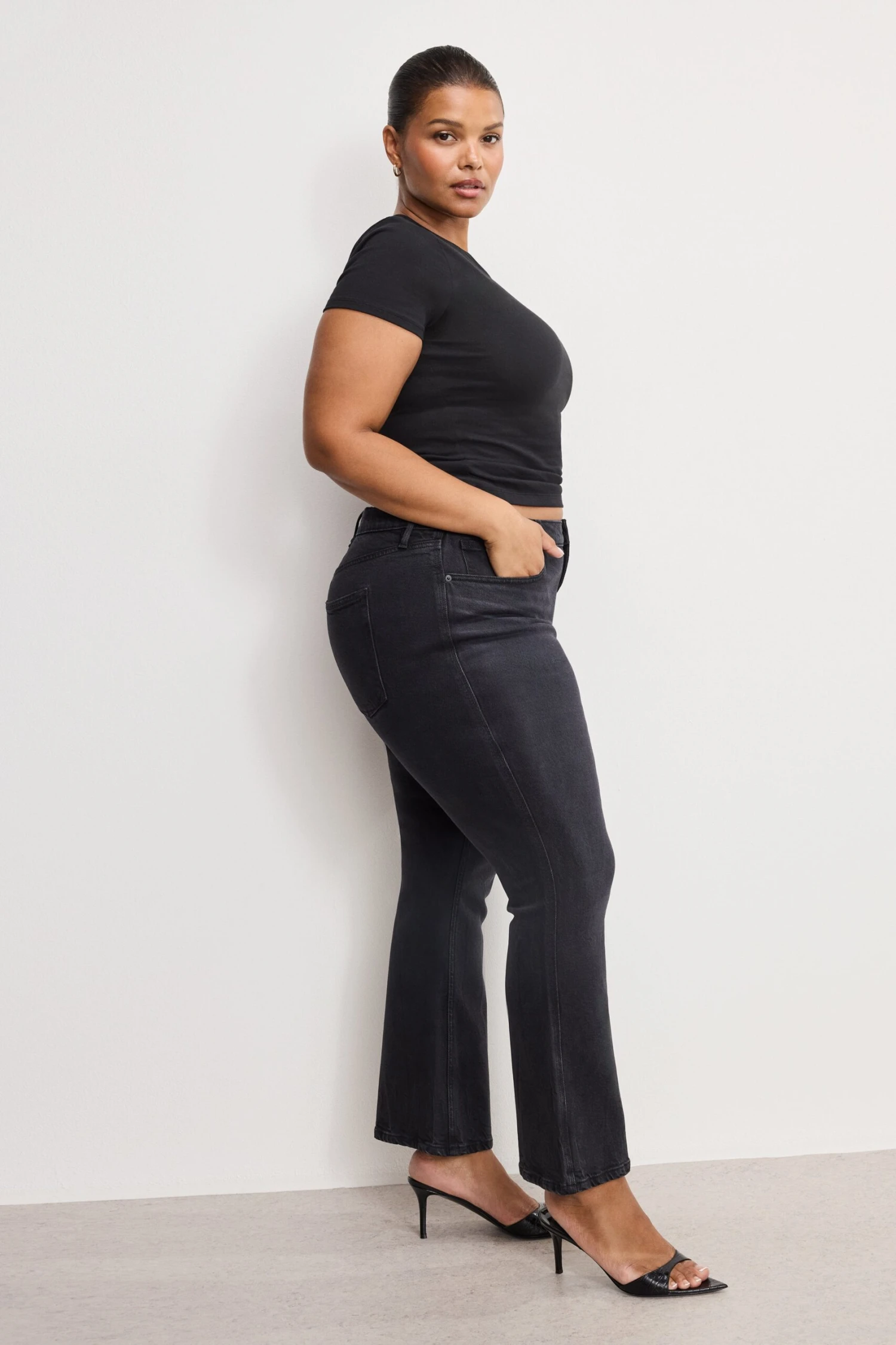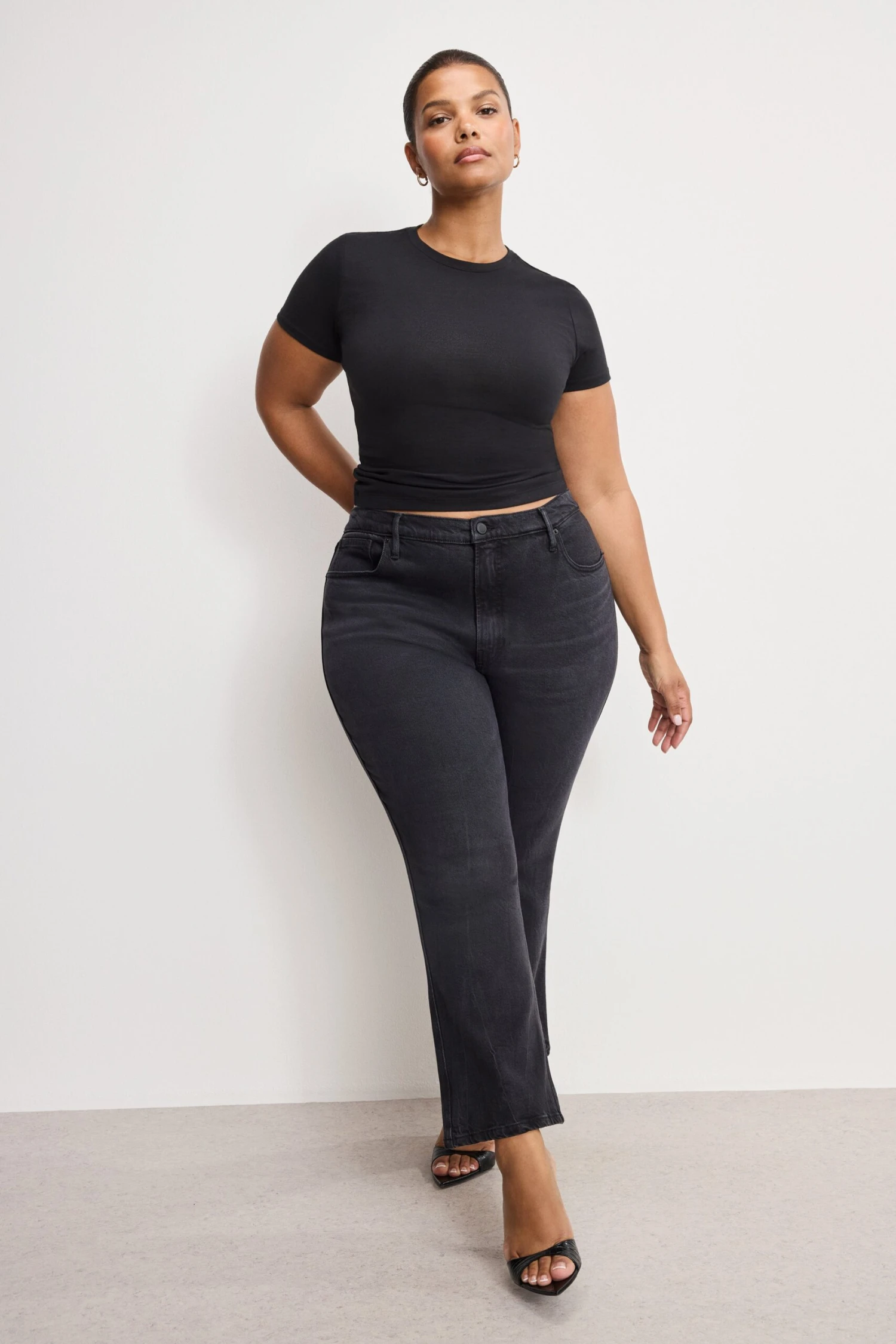 The ultimate statement jeans, featuring a high-rise waist, a raw hem, and a flattering kick flare silhouette.