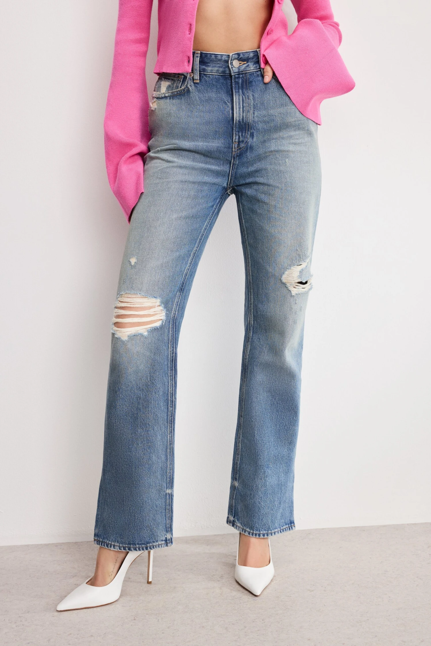 These super high-rise jeans are fitted through the legs and relax below the knee for a vintage-inspired straight silhouette. Light distressing adds a bold and edgy feel.