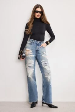 These super high-rise jeans are fitted through the legs and relax below the knee for a vintage-inspired straight silhouette. Extreme distressing adds a bold, edgy, worn-in look.