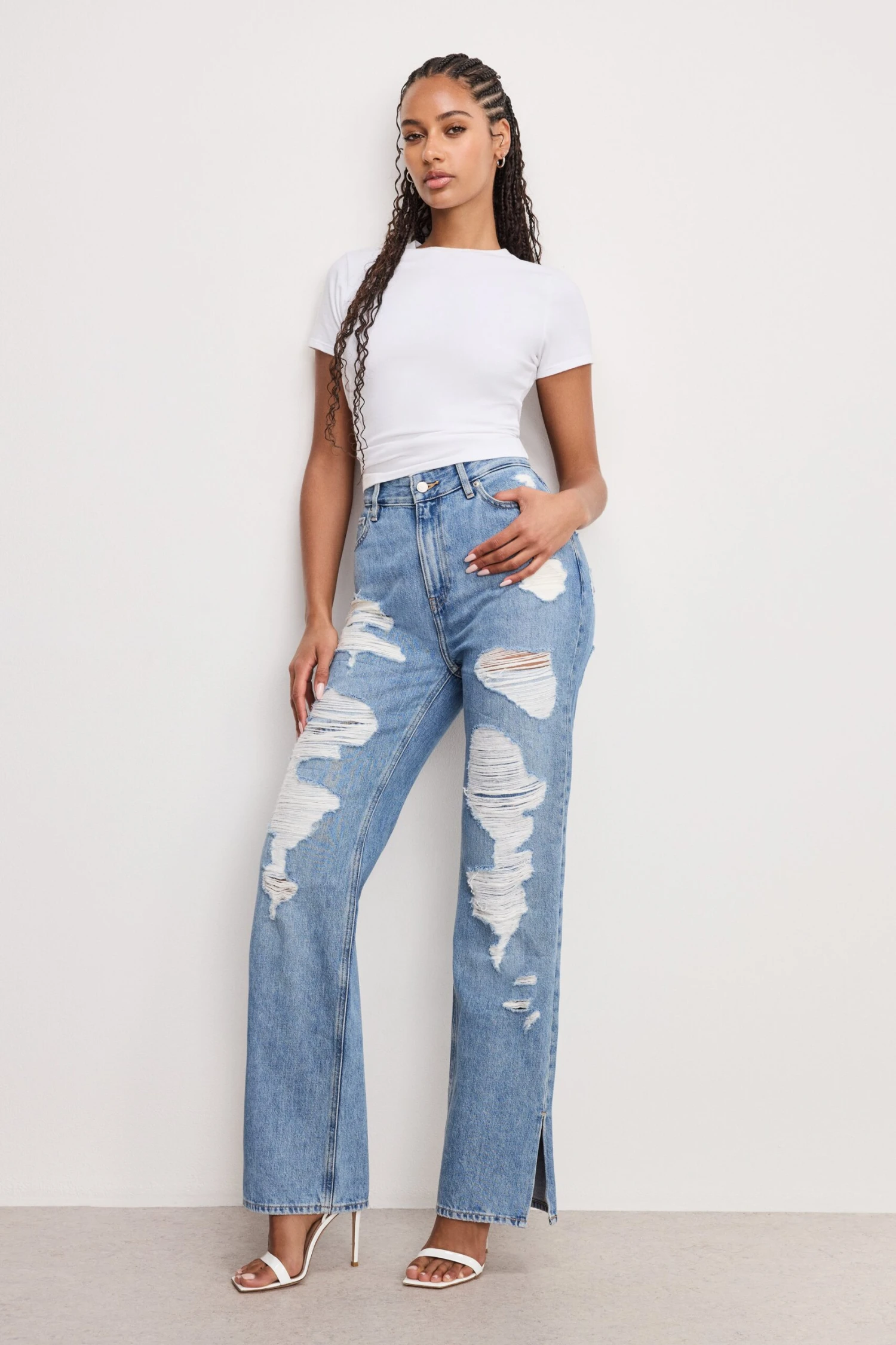 These super high-rise jeans are fitted through the legs and relax below the knee for a vintage-inspired straight silhouette. Extreme distressing adds a bold, edgy, worn-in look.