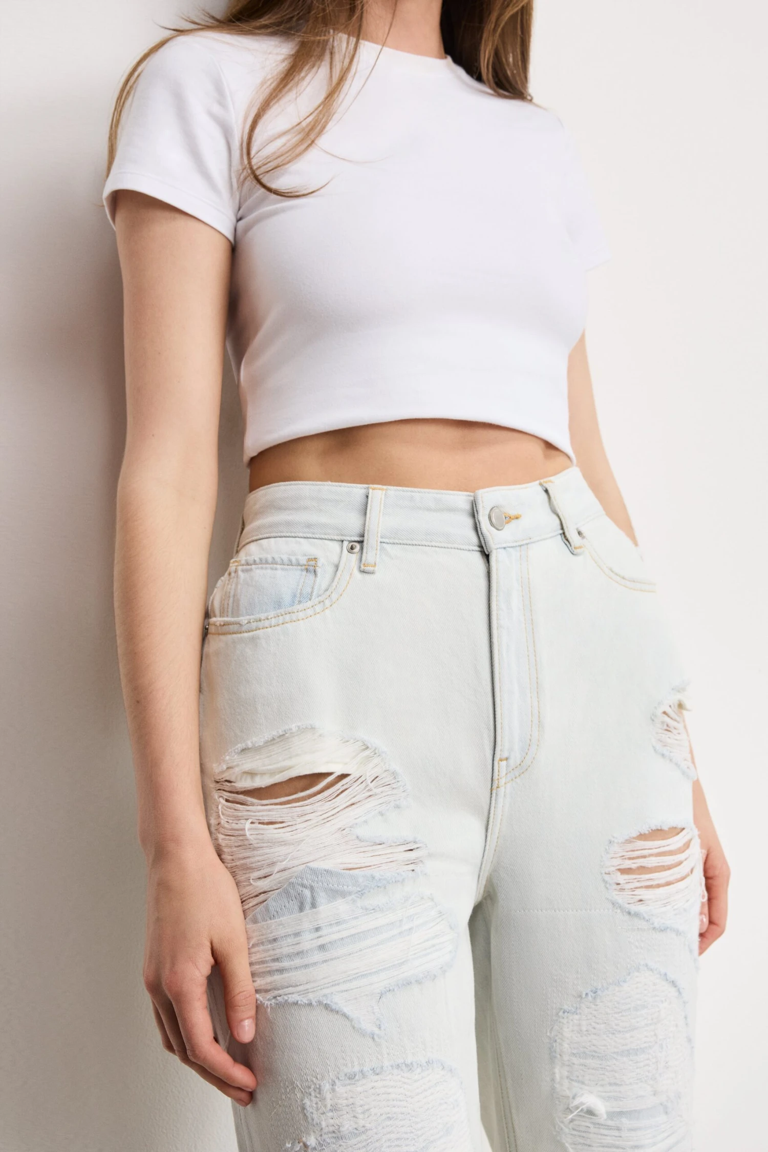 These super high-rise jeans are fitted through the legs and relax below the knee for a vintage-inspired straight silhouette. Extreme distressing adds a bold, edgy, worn-in look.
