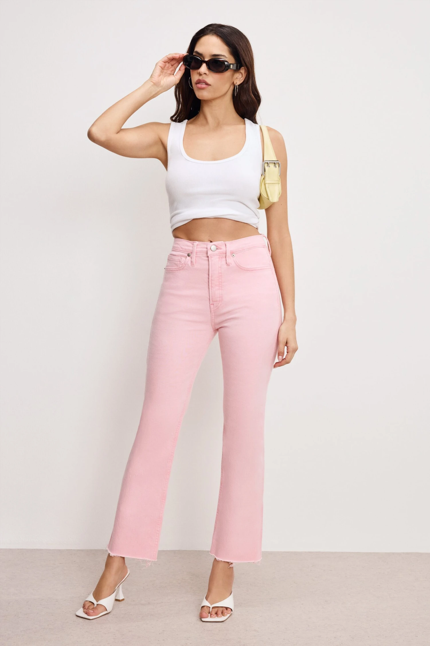 The ultimate statement jeans, featuring a high-rise waist, a raw hem, and a flattering kick flare silhouette.