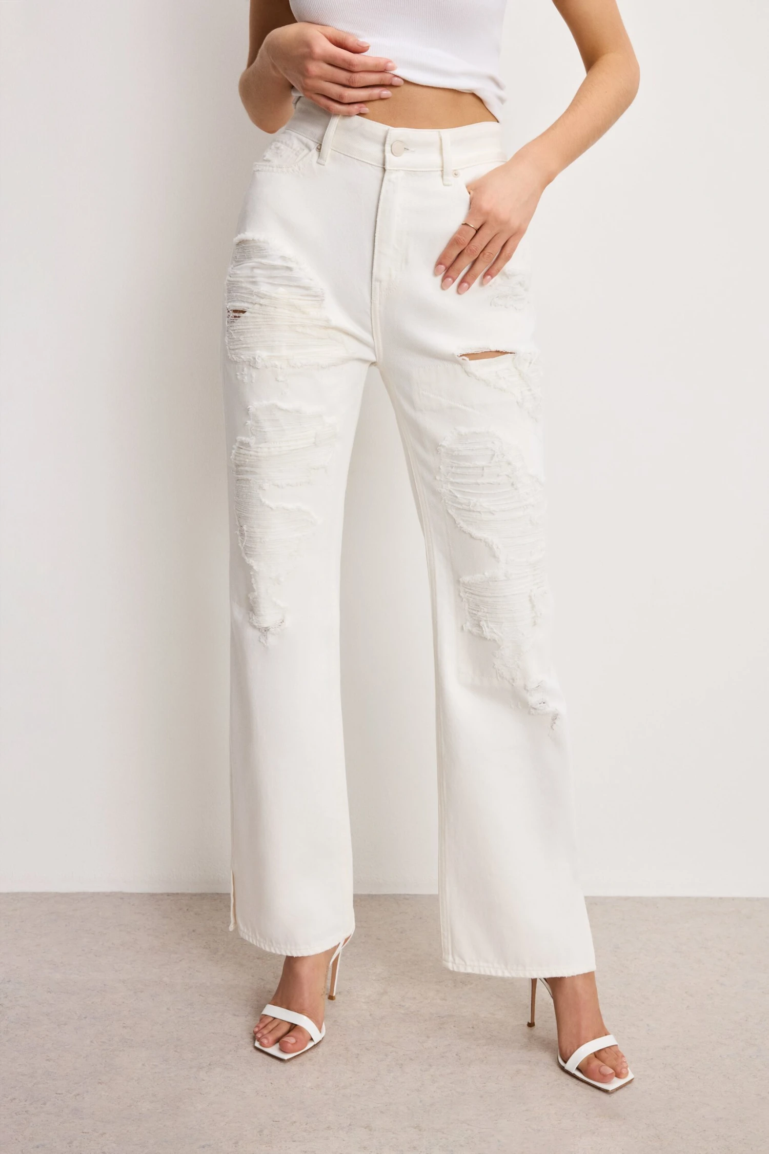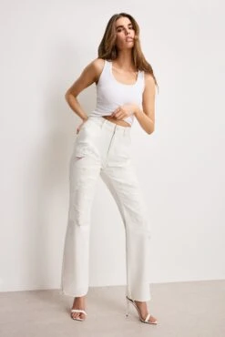 These super high-rise jeans are fitted through the legs and relax below the knee for a vintage-inspired straight silhouette. Extreme distressing adds a bold, edgy, worn-in look.