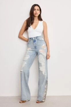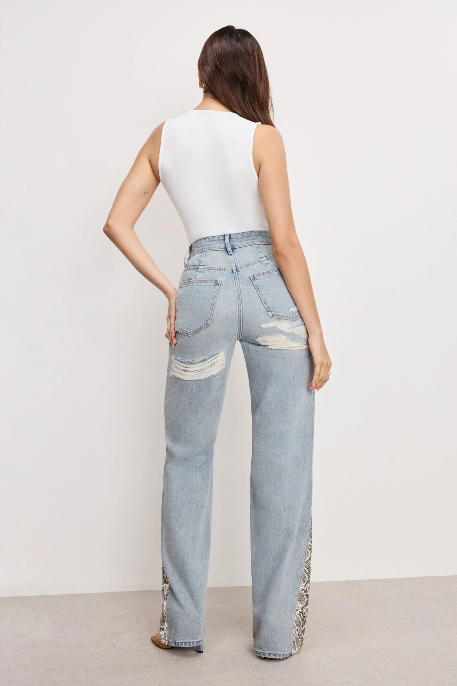 These super high-rise jeans are fitted through the hips and thighs, with a vintage-inspired straight silhouette. Extreme distressing adds a bold worn-in look, while a striking snake print side panel from the knee down gives them an unexpected twist. It’s denim with attitude and a whole lot of bite.